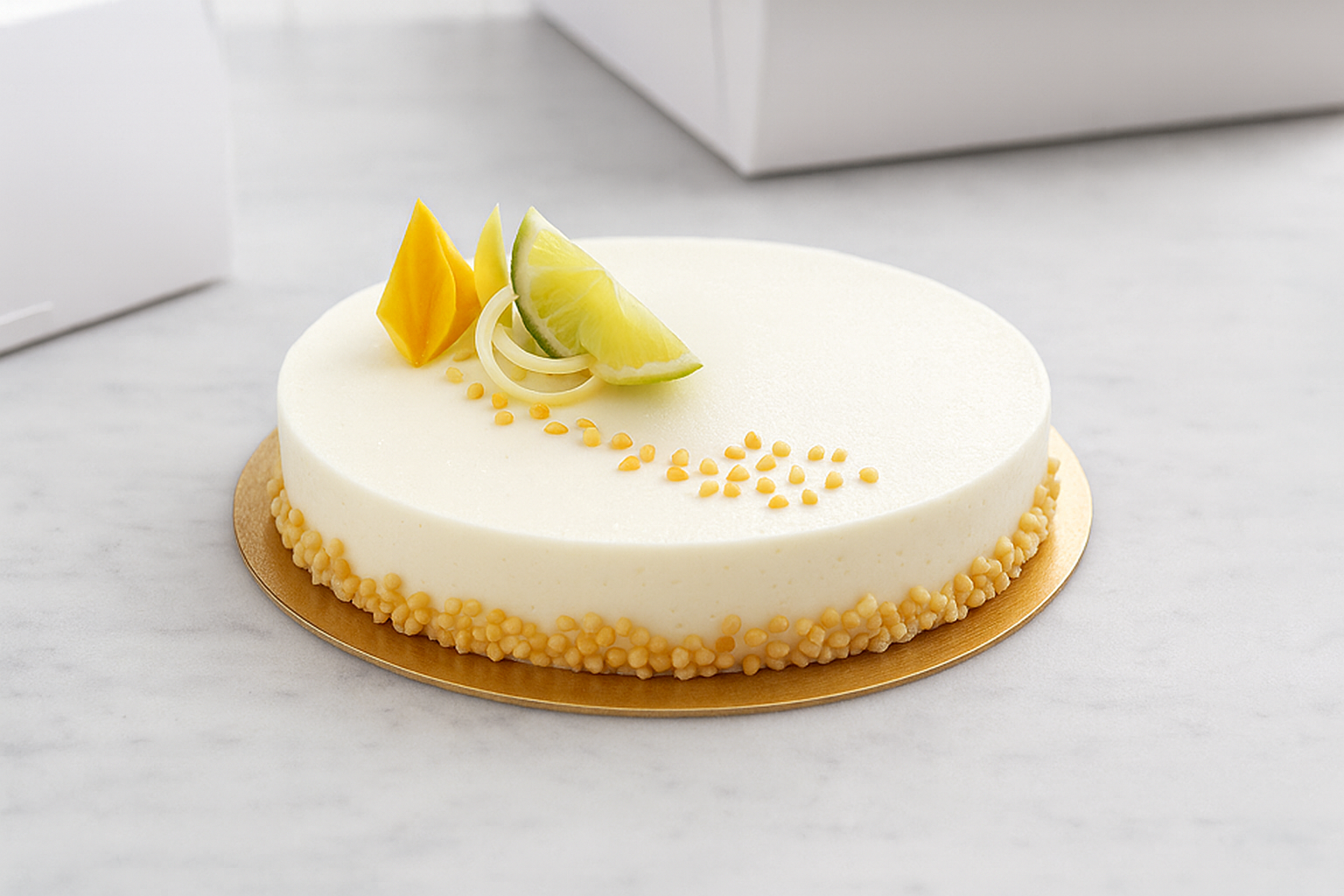 Mandelbotten, vit chokladmousse, limekräm och passionsmousse